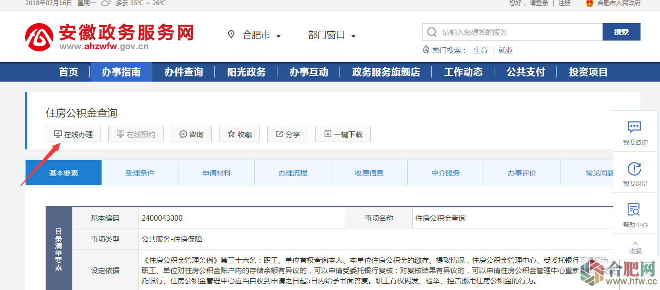 安徽政務服務網住房公積金查詢欄目,并點擊“在線查詢”