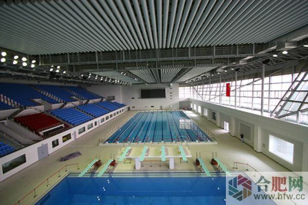安徽合肥體育中心游泳跳水館是安徽合肥體育中心“一場兩館”構成之一,建筑面積2.5萬㎡。游泳跳水館建筑層數為地上三層、地下一層(有一夾層),主體為鋼筋混凝土框架抗震墻結構,屋頂為鋼折板網架結構,抗震設防裂度7級,建筑耐火等級2級,停車數40輛(其中包括8個大車位),建筑耐久年限二級(50-100年),設計容納觀眾3100余人。游泳跳水館二層以上外墻均為幕墻體系,采用多棱體造型,與體育館造型相互呼應,并有自身個性。首層采用干掛花崗巖石質外墻,形成堅實的基座感,并與二層以上玻璃幕墻形成強烈的虛實對比立面效果。此館外部造型猶如紙折飛機,形成了躍躍欲試沖向藍天的藝術效果,不僅與綜合體育館和主體育場的建筑藝術協調一致,更形成了自己的獨特形象。按大型甲級游泳跳水館設計,可滿足游泳、跳水、水球、花樣游泳等國內重大比賽及國際單項比賽要求。館內比賽場地分為東西兩部分;西側跳水池為25×21×6m,設3m、5m、7m、10m跳臺和1m、3m跳板,東側游泳比賽池為25×50×3m,兼顧考慮花樣游泳、水球比賽的要求。看臺下設計有12.5×50×1.35~1.65m熱身訓練池,集約了建筑體量。游泳跳水館水處理系統采用了循環過濾水質處理器,池水達到室內水質標準,在水質處理器上安裝了板式加熱器,分別可以利用蒸汽加熱和中央空調機組產生的熱量對池水進行加溫,一年四季均可供訓練比賽使用。泳池采用了高檔無菌地磚和加熱系統,有效增強了運動員的舒適感。比賽區和訓練區分別裝有面積為86㎡的電子彩色顯示屏和36㎡的雙基色顯示屏,可以顯示計時計分數據,準確記錄運動員的比賽成績。整個計時計分系統和全館的音響系統采用國際高端產品,并設置了水下揚聲器。游泳館看臺為單邊設計,分上、下兩層,觀眾席3173個,其中貴賓席80個,位于看臺中央,記者席60個,位于貴賓席右側。