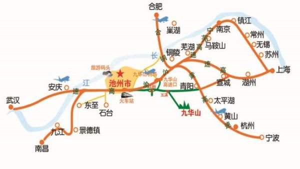 可乘列車至池州火車站、銅陵北火車站、合肥火車站后轉車至九華山